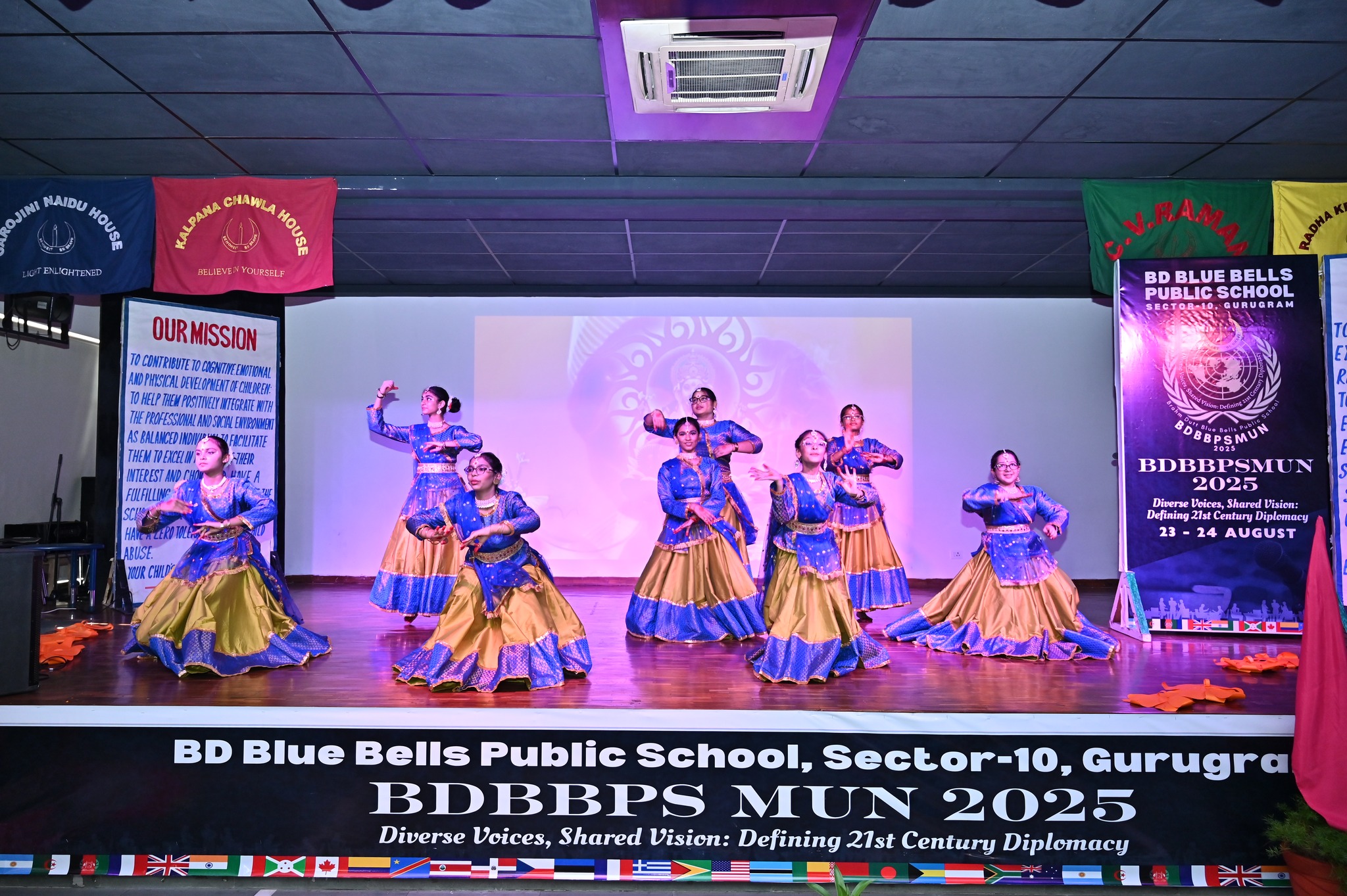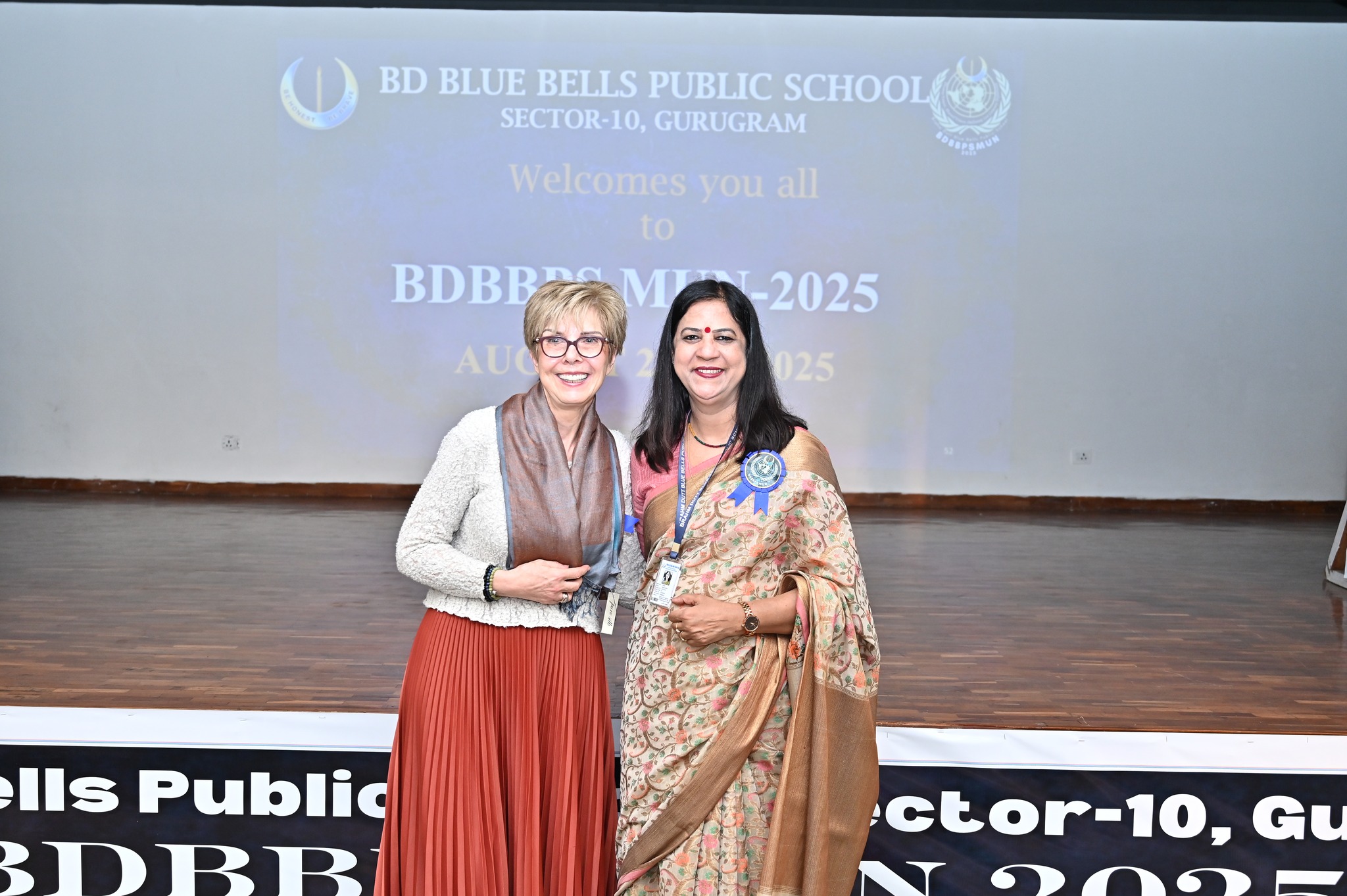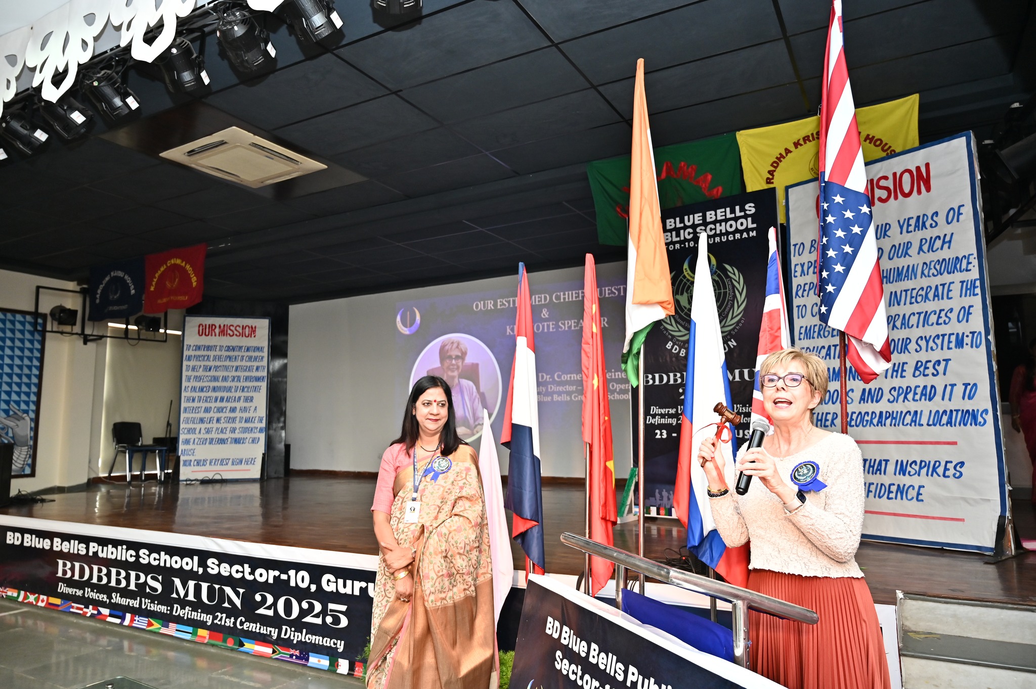 The Opening Ceremony on August 23, 2025, was a symphony of culture, pride, and purpose. After a soulful cultural presentation, Ms. Roopali Kudesia, Officiating Principal, BDBBPS, extended a heartfelt welcome to the distinguished dignitaries, delegates, and faculty, emphasizing the school’s relentless commitment to nurturing global dialogue and promoting student voices as instruments of peace. The keynote address by Dr. Cornelia Weiner, Deputy Director-School Operations, Blue Bells Group of Schools, our esteemed Chief Guest for the Opening Ceremony, set the tone for the days ahead. With eloquence and conviction, Dr. Cornelia championed empathy, inclusivity, and visionary leadership as the foundations of diplomacy in the 21st century, affirming the pivotal role of MUNs in shaping compassionate and responsible world leaders.