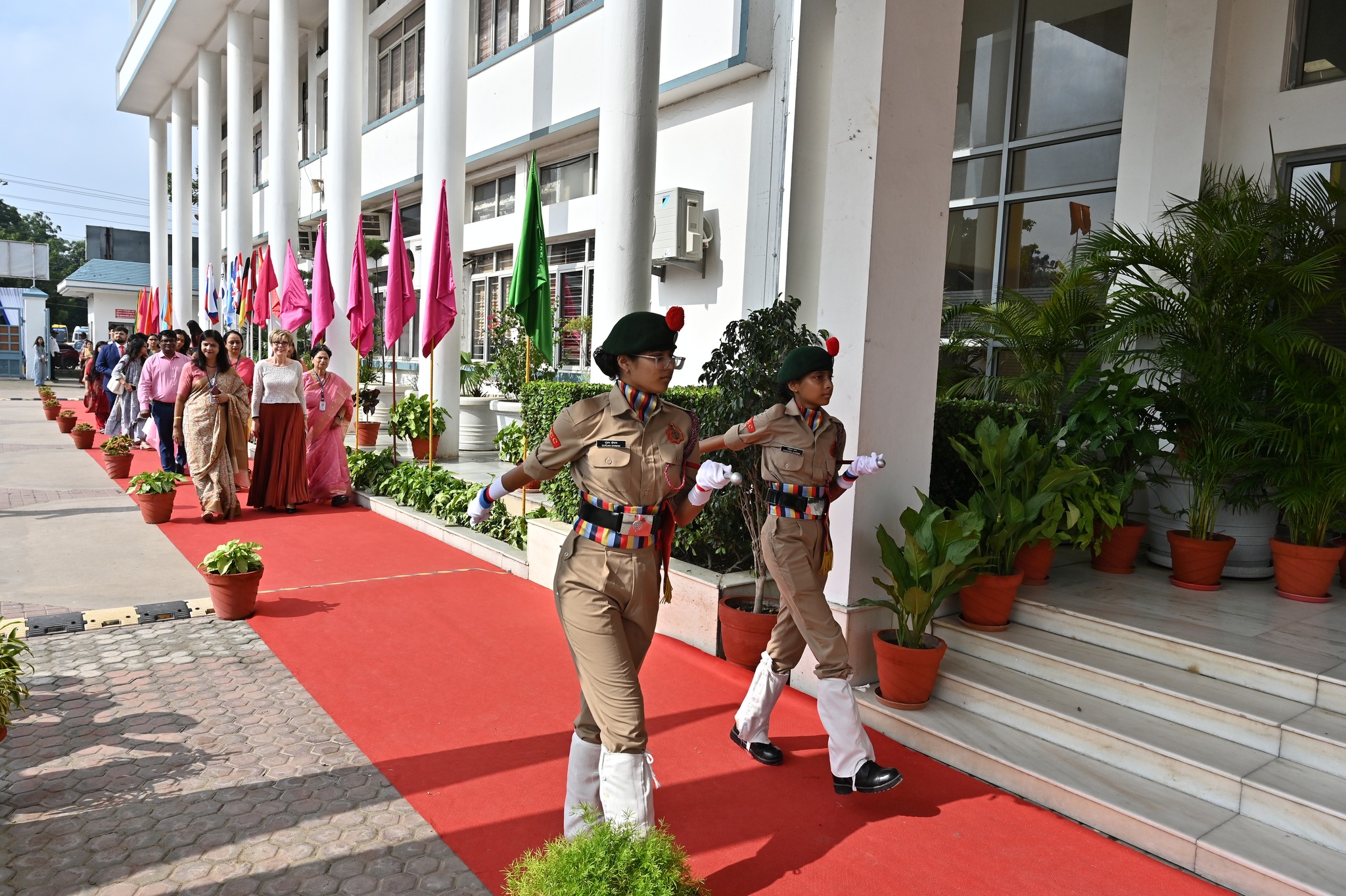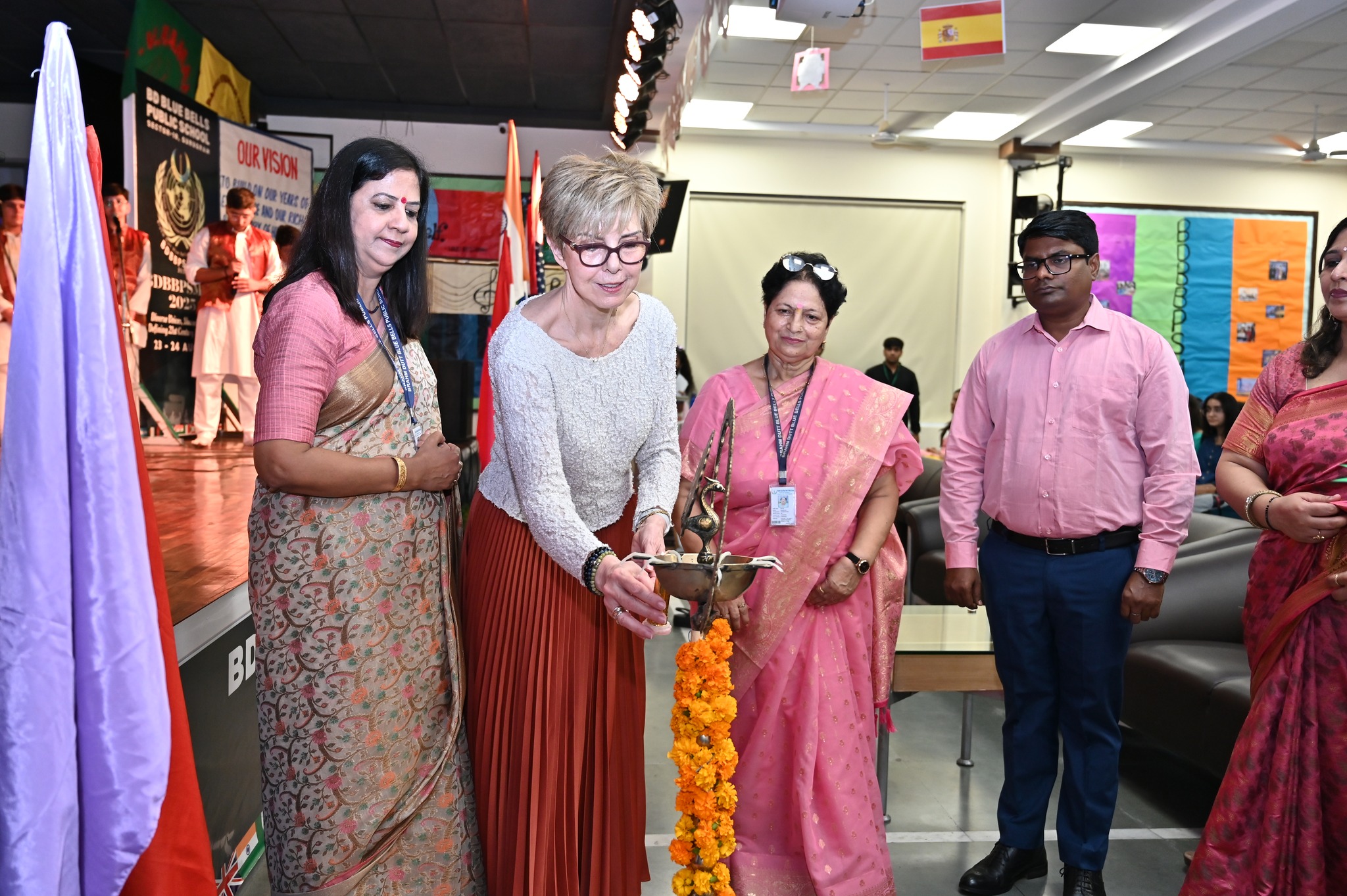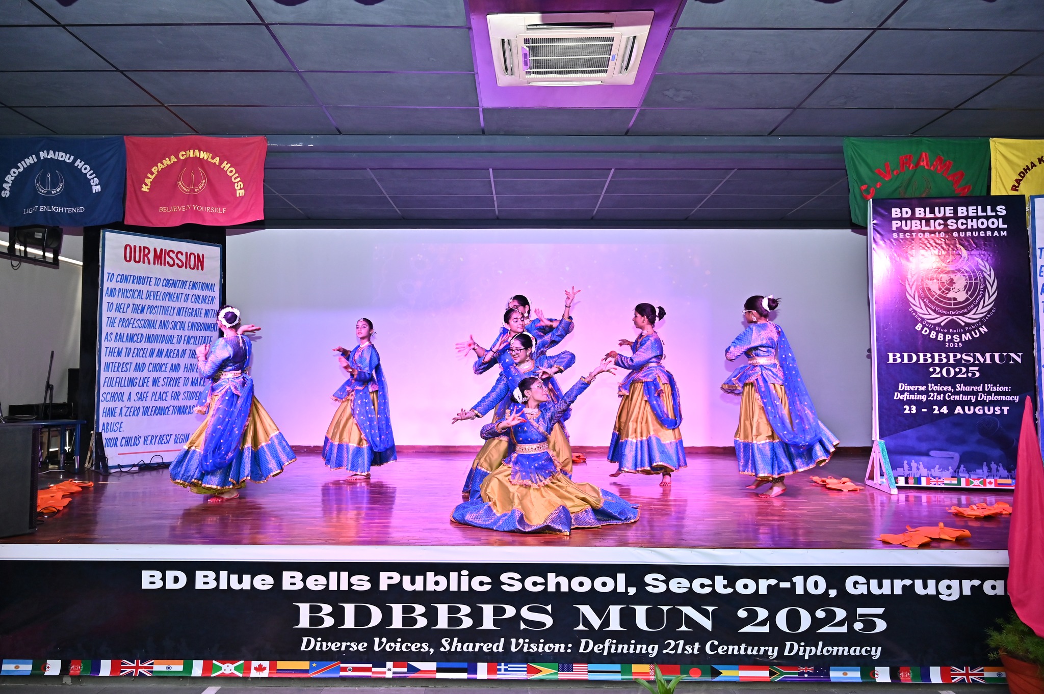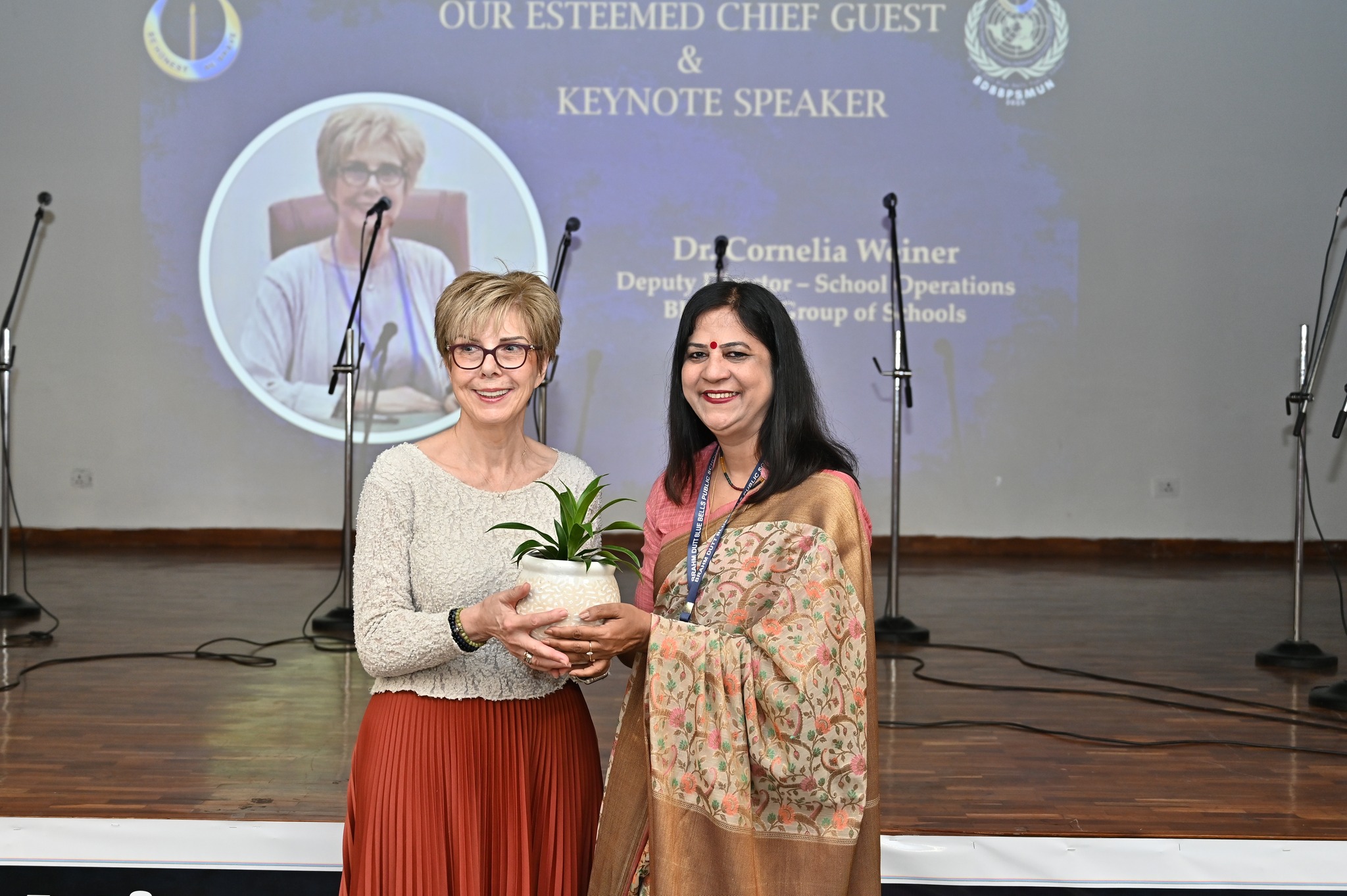 The Opening Ceremony on August 23, 2025, was a symphony of culture, pride, and purpose. After a soulful cultural presentation, Ms. Roopali Kudesia, Officiating Principal, BDBBPS, extended a heartfelt welcome to the distinguished dignitaries, delegates, and faculty, emphasizing the school’s relentless commitment to nurturing global dialogue and promoting student voices as instruments of peace. The keynote address by Dr. Cornelia Weiner, Deputy Director-School Operations, Blue Bells Group of Schools, our esteemed Chief Guest for the Opening Ceremony, set the tone for the days ahead. With eloquence and conviction, Dr. Cornelia championed empathy, inclusivity, and visionary leadership as the foundations of diplomacy in the 21st century, affirming the pivotal role of MUNs in shaping compassionate and responsible world leaders.