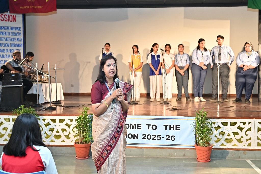 The first day of the new academic session unfolded with energy and enthusiasm as Class XII D led a dynamic morning assembly. The session commenced with the customary opening elements, followed by a heartfelt welcome address by the Vice Principal, Ms. Roopali Kudesia. A soulful devotional song by the students infused the gathering with inspiration and positivity.