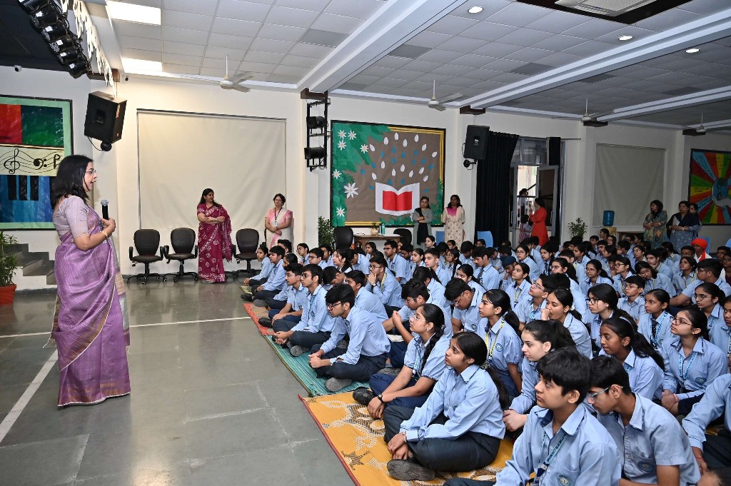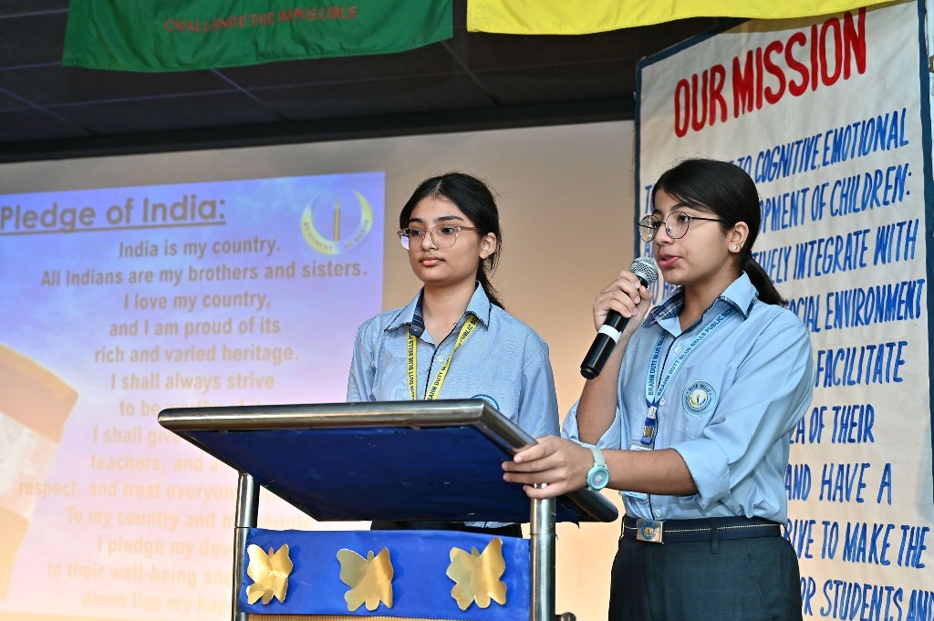The assembly opened with a heartfelt poem that eloquently captured the essence of Guru Nanak Dev Ji’s timeless teachings on truth, compassion, and humility. The centrepiece of the presentation was a beautifully enacted play portraying key moments from the Guru’s life. Each scene resonated with his universal messages of unity, selfless service, and unwavering faith in God. A brief yet engaging quiz that followed tested the audience’s attentiveness and deepened their connection to the Guru’s wisdom.