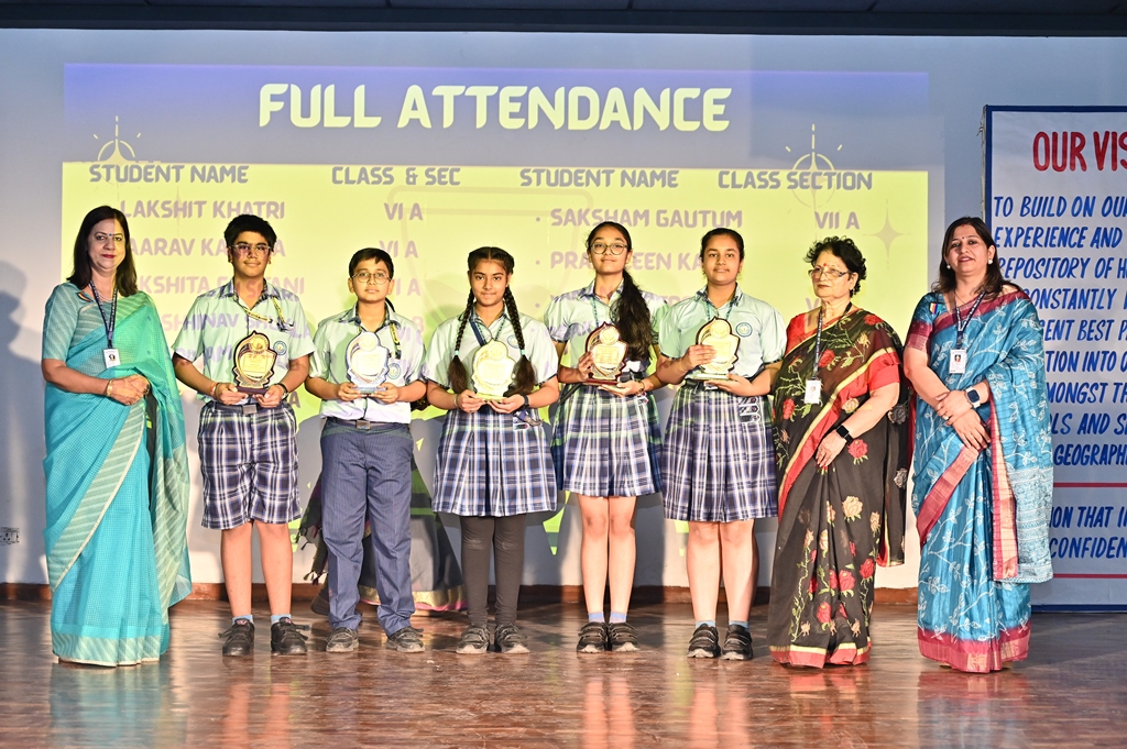 Ms. Madhu Talwar, the dynamic Middle Wing Leader, addressed the gathering with heartfelt words. She congratulated the achievers and encouraged every student to dream big and push boundaries. Her inspiring message on resilience and hard work resonated deeply with all present.