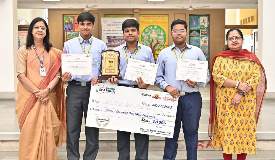 In a brilliant display of creativity and problem-solving, Gyanav Chauhan, Yash Kumar Sharma, and Aditya Tiwari of Class XI-B represented BD Blue Bells Public School at SPARDHA IDEATHON 4.0, hosted by Panipat Institute of Engineering and Technology (P.I.E.T.), Panipat on November 4, 2025.