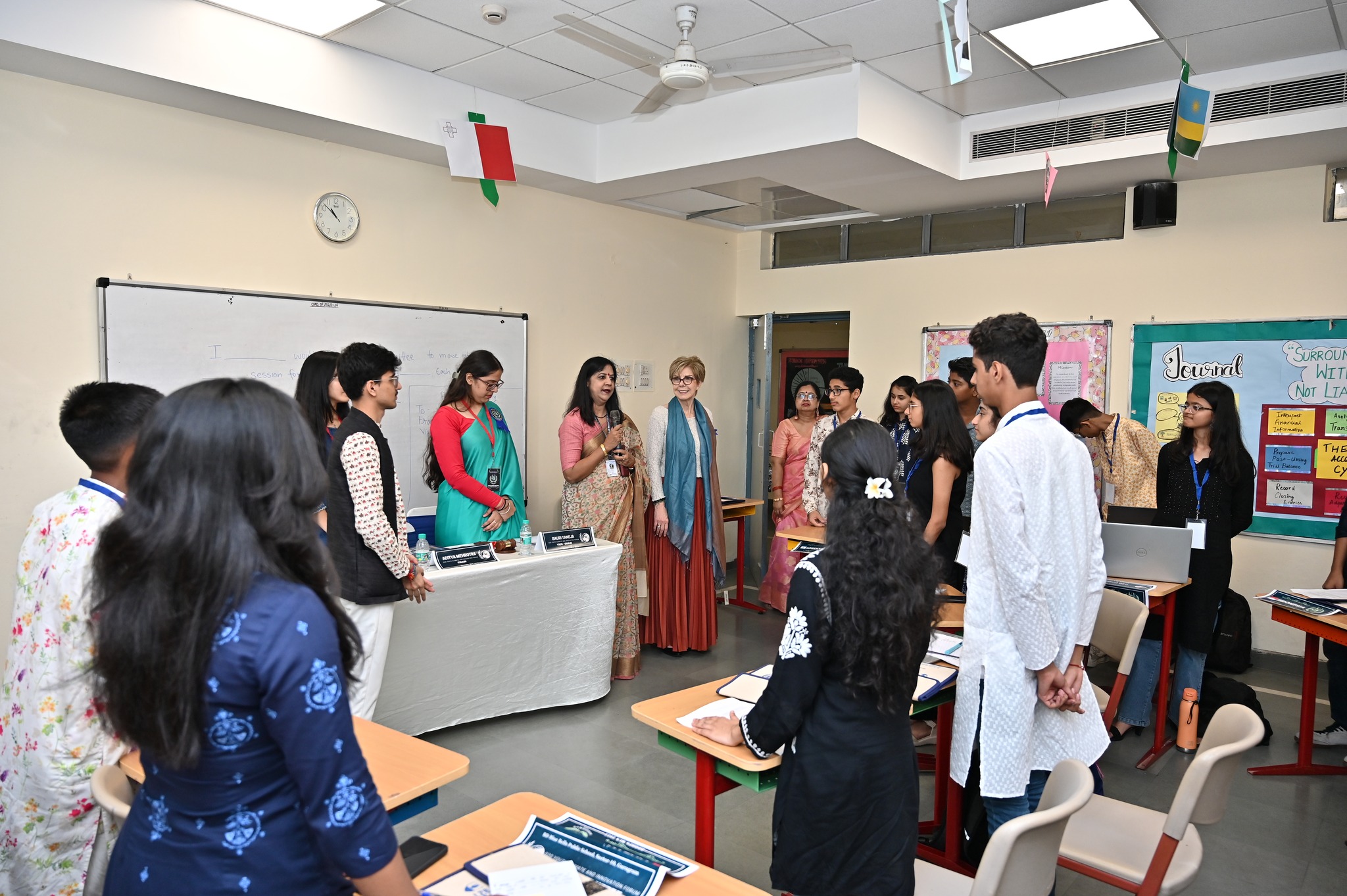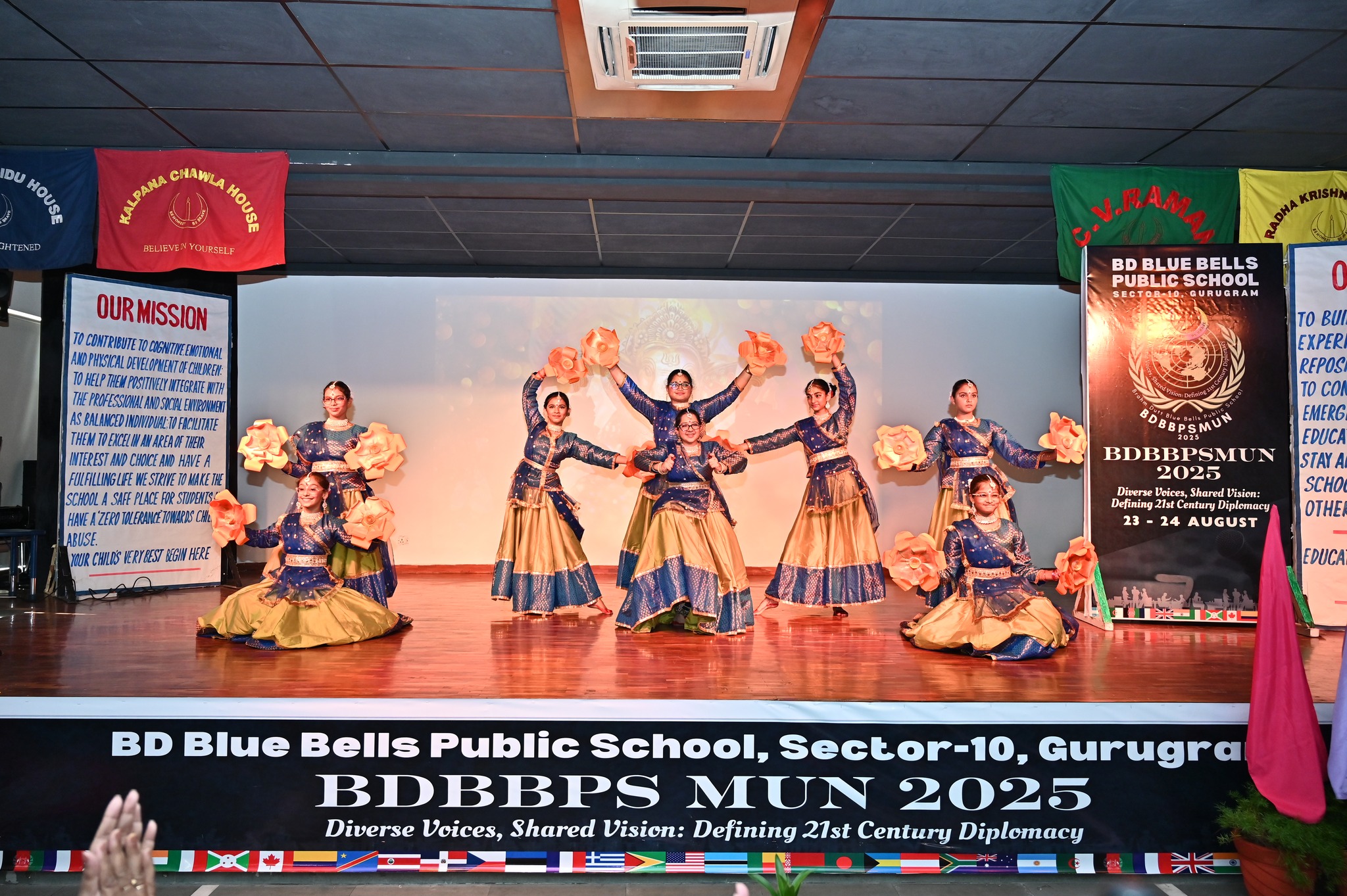 The Opening Ceremony on August 23, 2025, was a symphony of culture, pride, and purpose. After a soulful cultural presentation, Ms. Roopali Kudesia, Officiating Principal, BDBBPS, extended a heartfelt welcome to the distinguished dignitaries, delegates, and faculty, emphasizing the school’s relentless commitment to nurturing global dialogue and promoting student voices as instruments of peace. The keynote address by Dr. Cornelia Weiner, Deputy Director-School Operations, Blue Bells Group of Schools, our esteemed Chief Guest for the Opening Ceremony, set the tone for the days ahead. With eloquence and conviction, Dr. Cornelia championed empathy, inclusivity, and visionary leadership as the foundations of diplomacy in the 21st century, affirming the pivotal role of MUNs in shaping compassionate and responsible world leaders.