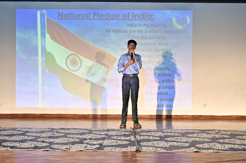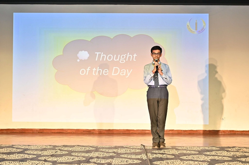 The assembly opened with a heartfelt poem that eloquently captured the essence of Guru Nanak Dev Ji’s timeless teachings on truth, compassion, and humility. The centrepiece of the presentation was a beautifully enacted play portraying key moments from the Guru’s life. Each scene resonated with his universal messages of unity, selfless service, and unwavering faith in God. A brief yet engaging quiz that followed tested the audience’s attentiveness and deepened their connection to the Guru’s wisdom.