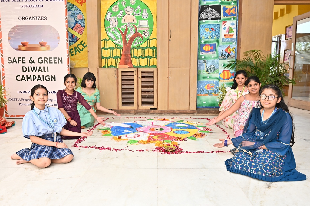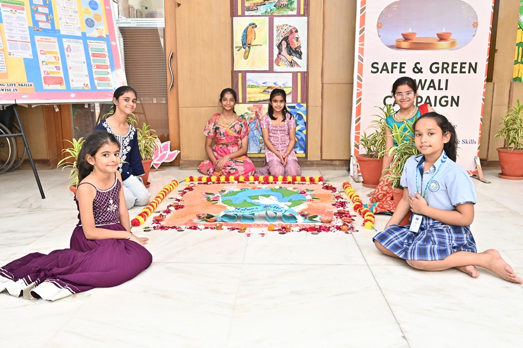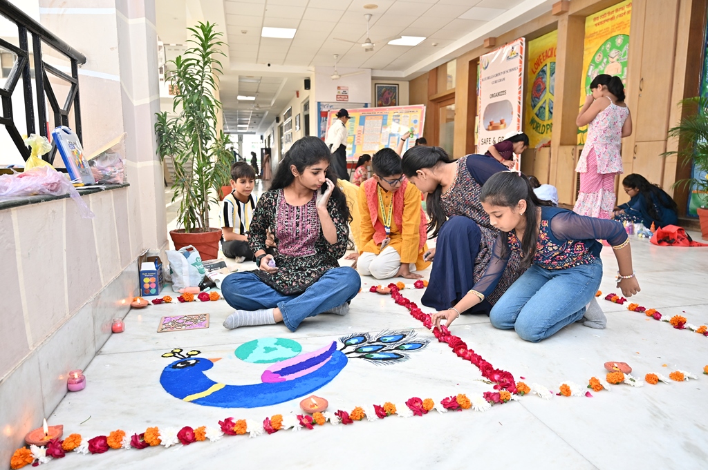 In a radiant celebration of Diwali, the Primary Wing came alive with colours and creativity during the Inter-House Rangoli Competition. Young artists poured their imagination onto the floor, weaving breathtaking patterns that beautifully captured the theme “Illuminate Nature, Celebrate Peace.”