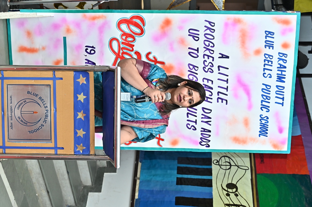 Ms. Madhu Talwar, the dynamic Middle Wing Leader, addressed the gathering with heartfelt words. She congratulated the achievers and encouraged every student to dream big and push boundaries. Her inspiring message on resilience and hard work resonated deeply with all present.